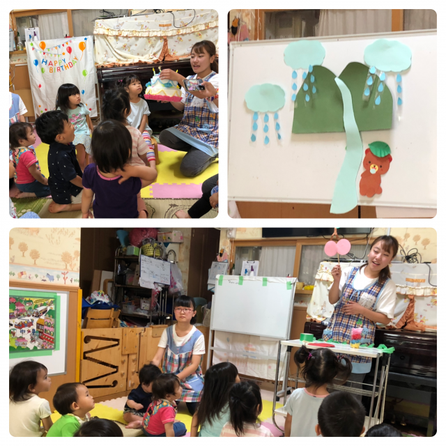 お誕生日会をしました! 2019/06/18(火) 今日は6月生まれのお友達のお誕生日会がありました。お誕生日のお友達は、フェルトでできたケーキのロウソクの火をフーっと吹き消し、みんなでお祝いしました。その後は、保育士からの出し物で、ペープサート等を...