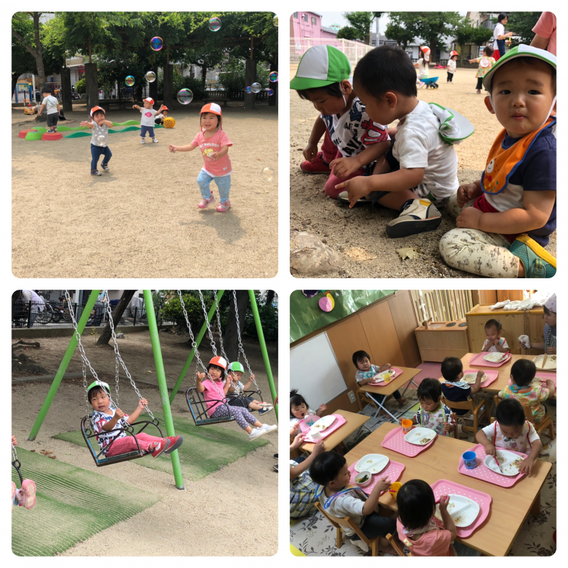 シャボン玉をしました☆ミ 2019/06/19(水) 今日は公園に出ると、子どもたちの大好きなシャボン玉をしました。ふわふわ飛んでいるシャボン玉を、両手を伸ばして追いかける子供たちの姿がとっても可愛らしかったです!他にも、木にいる虫を観察したり、ブラ...