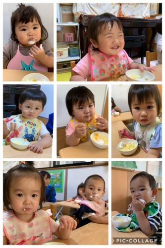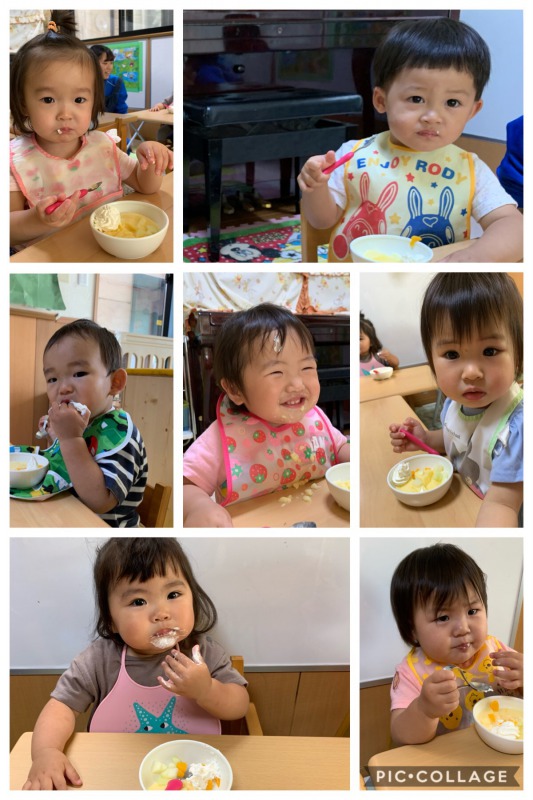 お誕生日会の日のおやつはプリンでした♪ 2019/06/18(火) お誕生日会の日はおやつにプリンアラモードが出ました♪生クリームを目の前で絞り、楽しいおやつのお時間です。たくさん頬張り、生クリームをおでこに付けたりおひげになったり、あちこちにつけながら食べている子...