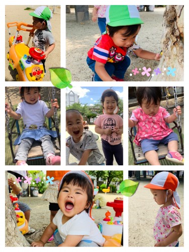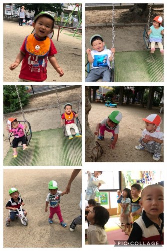 ブランコや三輪車をして遊びました♪ 2019/06/21(金) 今日は、とってもいいお天気でした。10分間の英語をした後に、公園に行きました。真っ先にブランコへ走るお友達や、アンパンマンのコンビカーや三輪車に走るお友達、木にいる虫を見に行くお友達です。りす組さん...