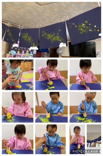 天の川をつくりました♪ 2019/07/01(月) 雨が降っていたのもあり、お部屋で天の川の制作をしました。たんぽうしというものに黄色の絵の具をつけ、紺色の画用紙にとんとんと、星空をつくっていきました。真剣な表情で、一生懸命やってくれる子どもたちで...