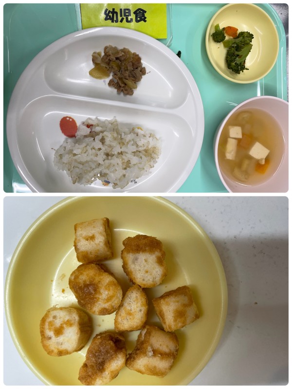 ご飯、豚肉の生姜焼き、ブロッコリーのおかか和え、けんちん汁 15時のおやつ きな粉ふのラスク