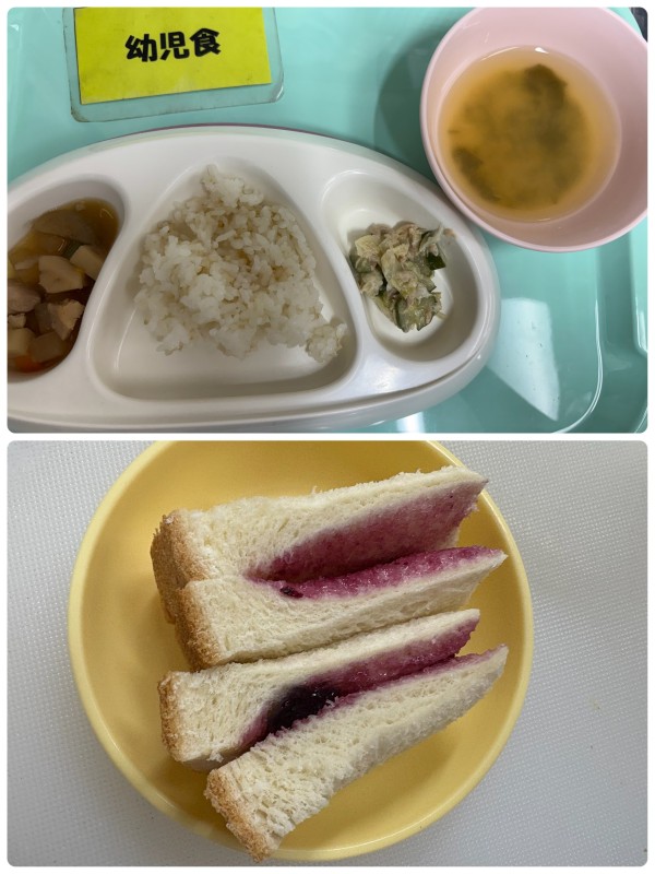 ご飯、筑前煮、キャベツのツナマヨ和え、みそ汁 15時のおやつ ジャムサンド