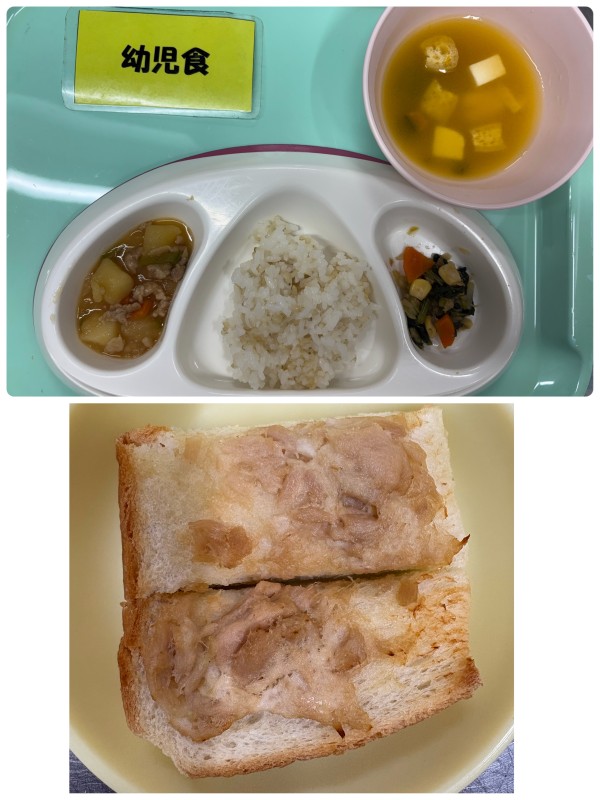 ご飯、肉じゃが、小松菜のおかか和え、みそ汁 15時のおやつ ツナトースト