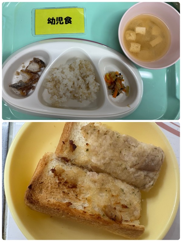 ご飯、魚の竜田揚げ、白菜の昆布和え、みそ汁 15時のおやつ ツナトースト