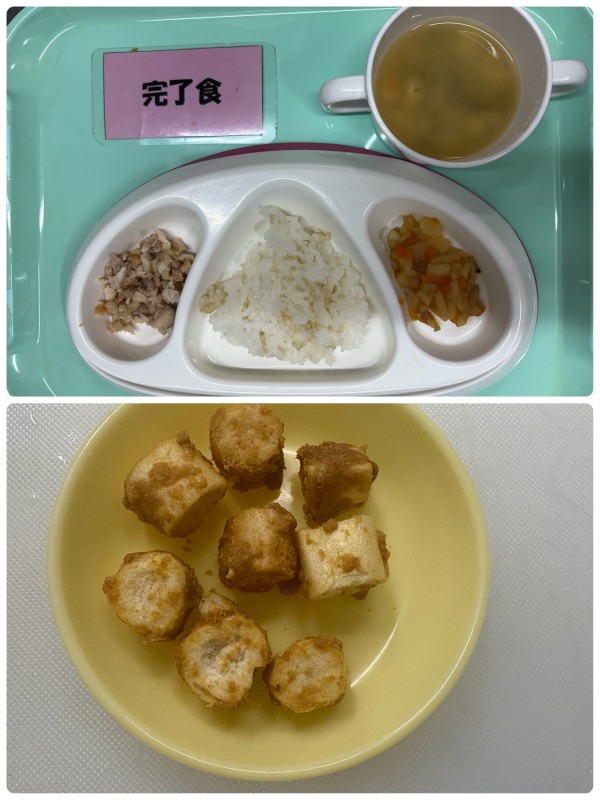 ご飯、鶏のマーマレード焼き、じゃがいもきんぴら、みそ汁 15時のおやつ きな粉麩のラスク