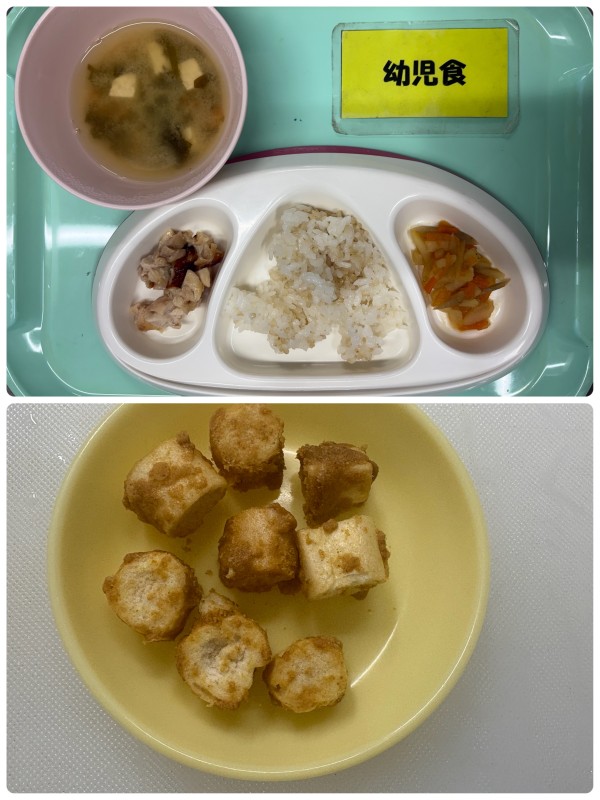 ご飯、鶏のマーマレード焼き、じゃがいもきんぴら、みそ汁 15時のおやつ きな粉麩のラスク