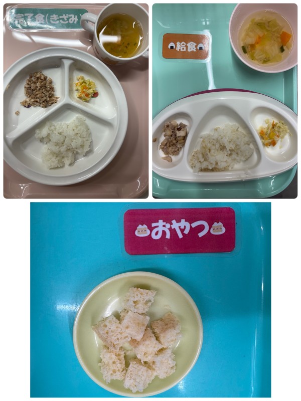 ご飯、鶏のごま味噌焼き、コールスローサラダ、すまし汁 15時のおやつ 蒸しパン