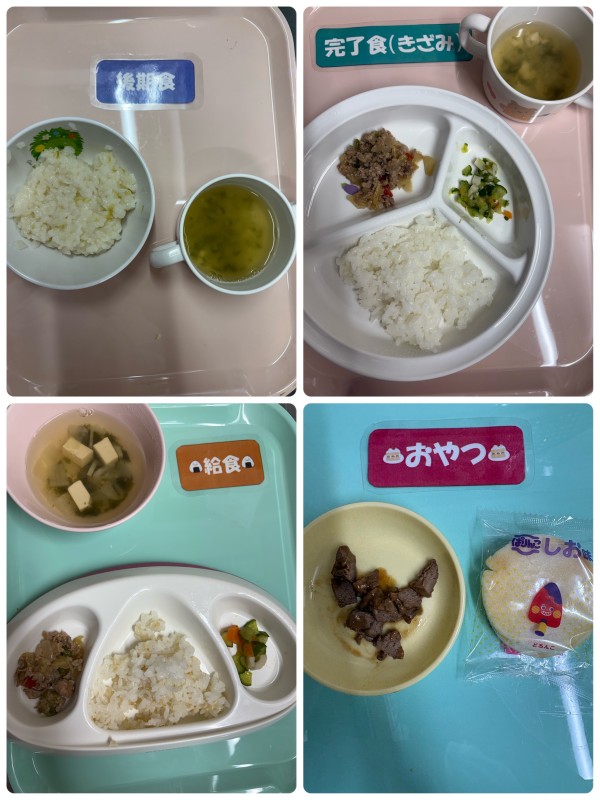 後期 たまねぎときゃべつのおじや 完了食、普通食 ご飯、キャベツと豚肉の味噌炒め、きゅうりの酢の物、豆腐すまし汁 15時のおやつ 鶏レバーの甘辛煮、ぱりんこ