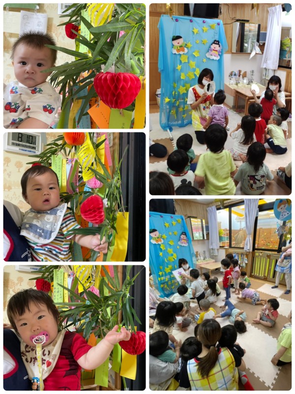 七夕の集いがありました!お部屋にあるお星様を見つけると触ろうと手を伸ばしたり、指をさしたりと興味津々なひよこ組さん!みんなのお願い事が叶いますように☺️✨